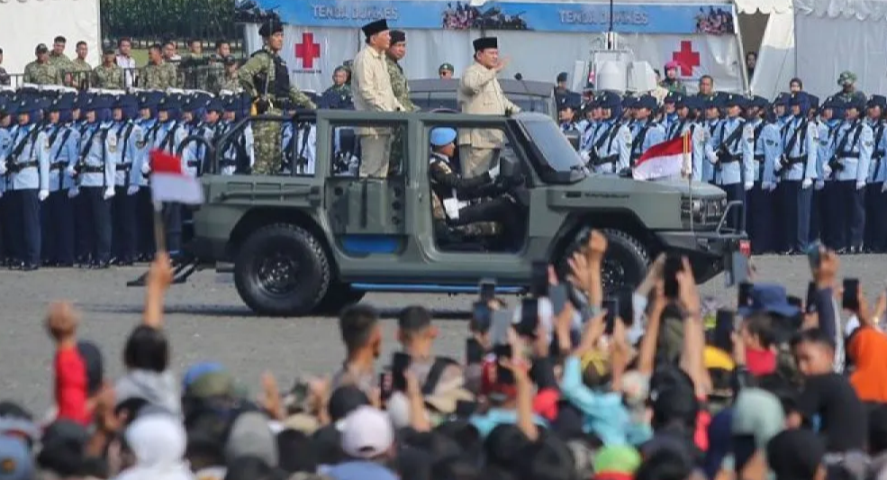 Setibanya di lapangan upacara, Presiden Prabowo langsung menuju mimbar kehormatan dan disambut hangat oleh Wakil Presiden Gibran Rakabuming Raka.