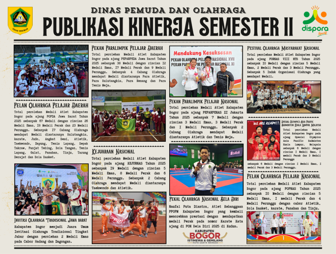 Prestasi semakin lengkap dengan keberhasilan atlet Kabupaten Bogor di berbagai ajang khusus dan internasional. Kabupaten Bogor menjadi juara umum Invitasi Olahraga Tradisional Jawa Barat, meraih 10 medali pada Festival Olahraga Masyarakat Nasional (FORNAS) VIII NTB 2025, serta menambah enam medali pada Spesial Olympics Asia Pasific Badminton di Kuala Lumpur. Capaian ini menegaskan konsistensi pembinaan atlet oleh DISPORA Kabupaten Bogor sepanjang Semester II 2025 . (Adv*/)