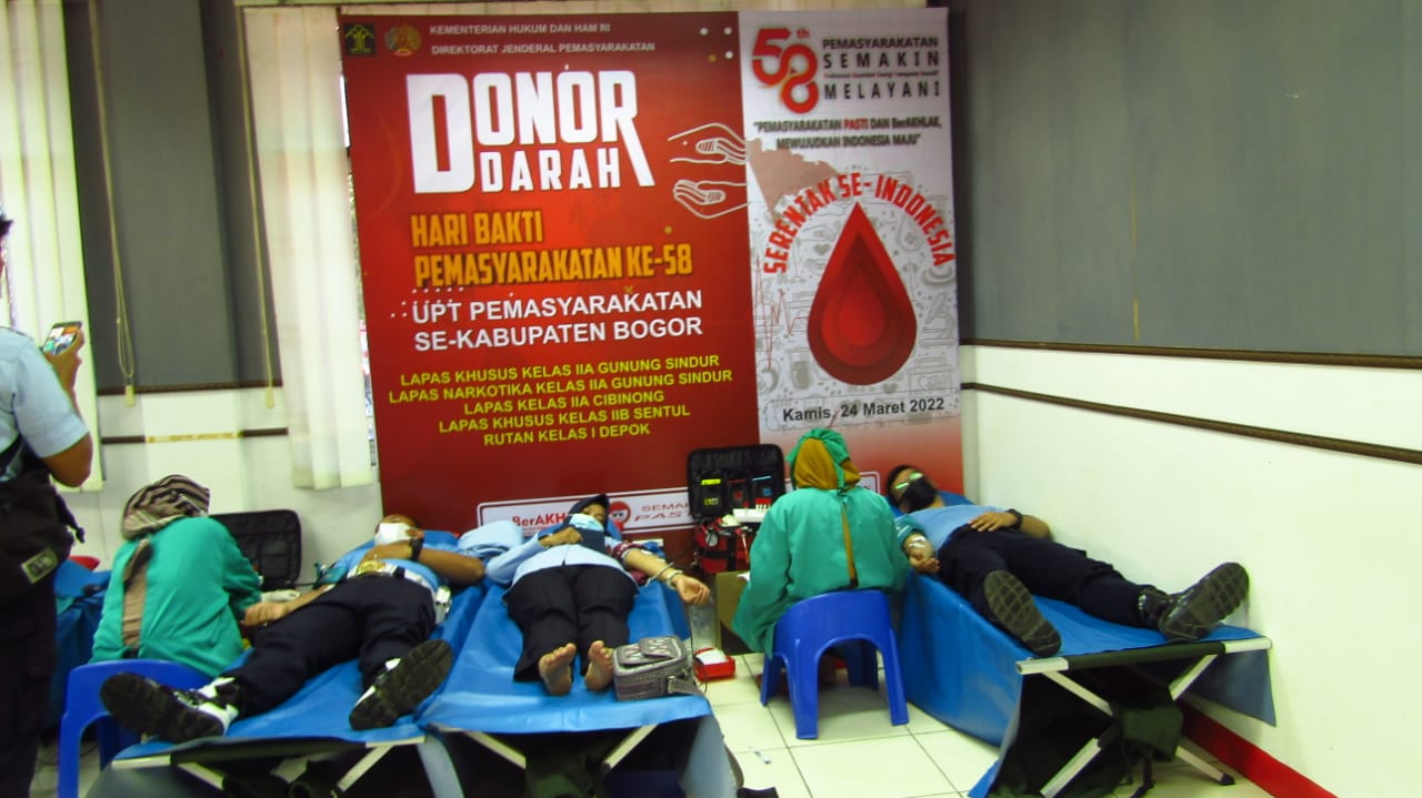 CIBINONG — Petugas Pemasyarakatan dari Unit Pelaksana Teknis (UPT) Pemasyarakatan Wilayah Kabupaten Bogor melaksanakan donor darah, menyambut Hari Bhakti Pemasyarakatan (HBP) Ke-58, bertempat di Lapas Khusus Kelas IIA Gunung Sindur, Kamis 24 Maret 2022