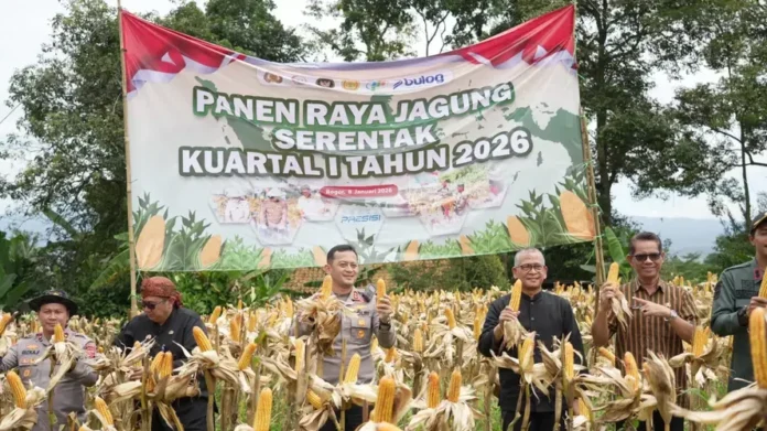 Kabarindo24jam.com | Cibinong – Mewakili Bupati Bogor Rudy Susmanto yang berkomitmen mendukung ketahanan pangan nasional, Kepala Dinas Tanaman Pangan, Hortikultura, dan Perkebunan (Distanhorbun) Kabupaten Bogor, Entis Sutisna, mengikuti kegiatan Panen Raya Jagung Serentak Kuartal I Tahun 2026 di Desa Tugujaya, Kecamatan Cigombong, Kabupaten Bogor, Kamis (8/1/2026).