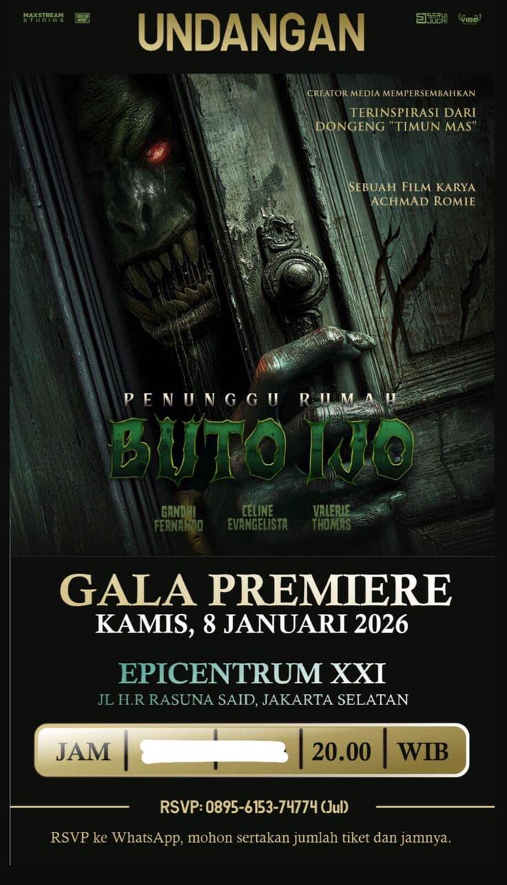 Kabarindo24jam.com | Jakarta — Industri film horor Indonesia kembali menghadirkan terobosan baru melalui film PENUNGGU RUMAH: BUTO IJO, sebuah re-imajinasi dongeng klasik Timun Mas yang diolah dengan pendekatan horor psikologis dan visual modern. Film ini akan melangsungkan Gala Premiere pada Kamis, 8 Januari 2026, di Epicentrum XXI, Jakarta Selatan.