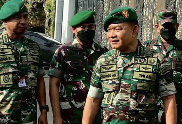 MERAUKE – Kepala Staf TNI Angkatan Darat (KSAD) Jendral TNI Dudung Abdurachman mengunjungi para prajuritnya di kesatuan Yonif 123/RW yang sedang melaksanakan tugas pengamanan perbatasan RI-PNG di Merauke – Papua. Selasa, (12/4/2022).