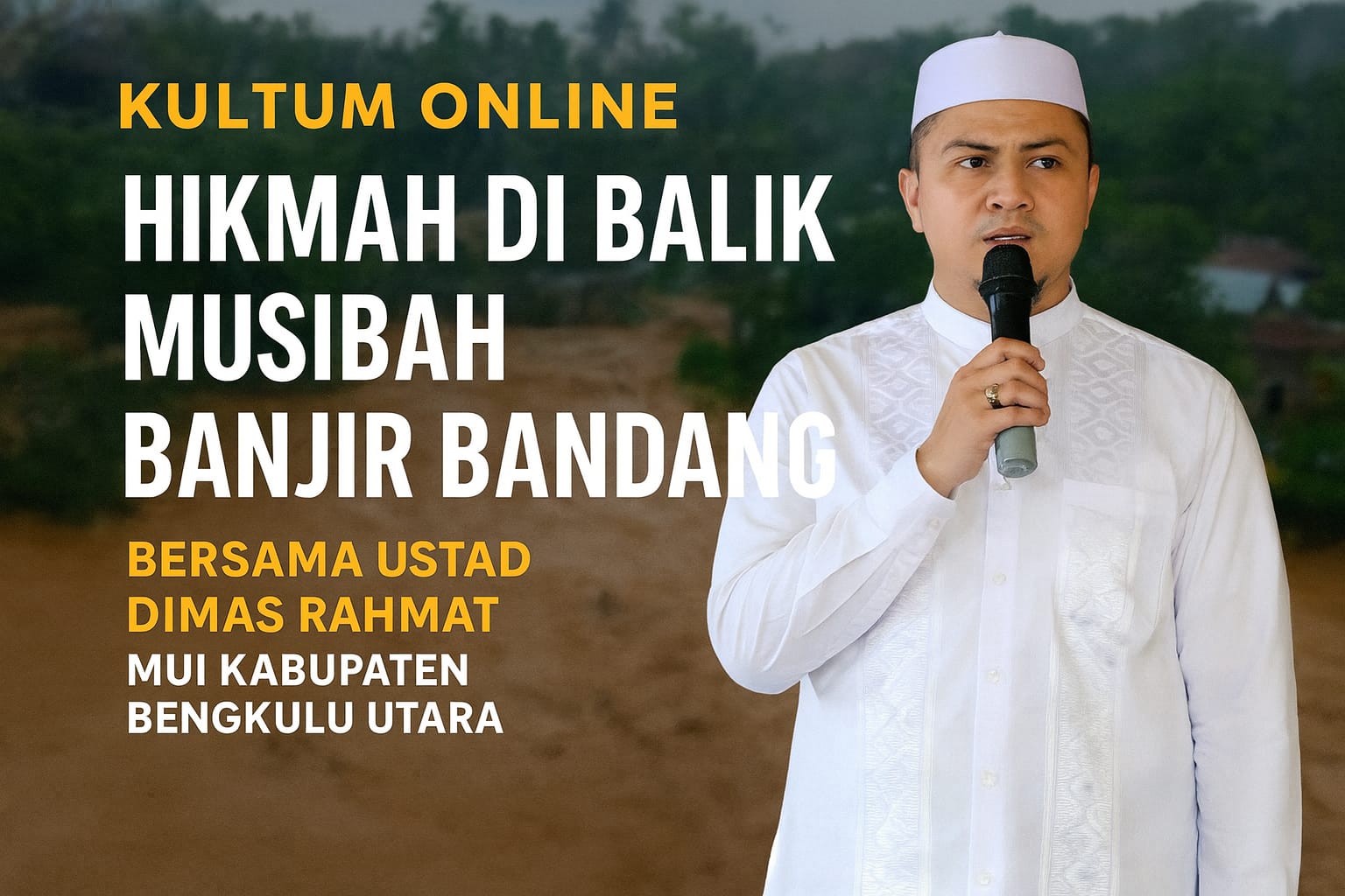 Kabarindo24Jam.com | Bengkulu — Assalamu’alaikum warahmatullahi wabarakatuh. Saudaraku yang dirahmati Allah, pada kultum online hari ini bersama Ustad Dimas Rahmat dari MUI Kabupaten Bengkulu Utara, kita merenungi musibah banjir bandang yang melanda saudara-saudara kita di Sumut, Sumbar, dan Aceh. Rumah hanyut, keluarga terpisah, dan banyak harta lenyap dalam sekejap. Namun, di balik setiap musibah, Allah selalu menitipkan hikmah dan hakikat kehidupan.