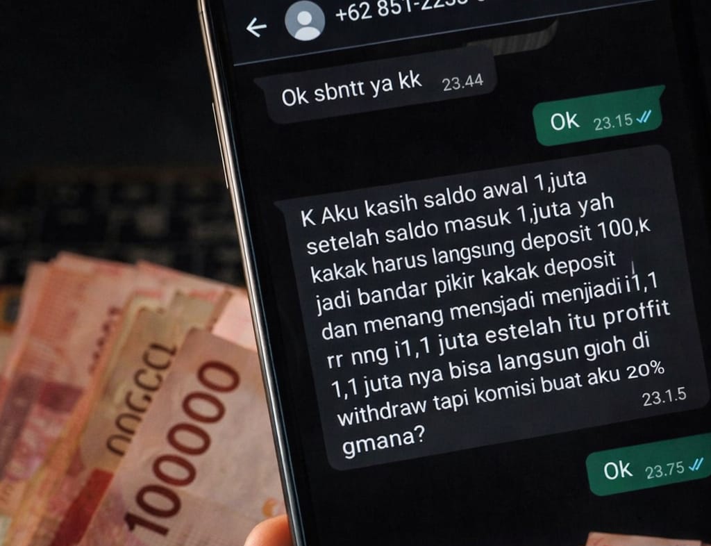 Sebuah modus penipuan baru beredar melalui pesan WhatsApp dari nomor tak dikenal. Pelaku menghubungi korban secara acak dengan menawarkan keuntungan instan berupa saldo awal sebesar Rp1 juta di sebuah situs permainan daring.
