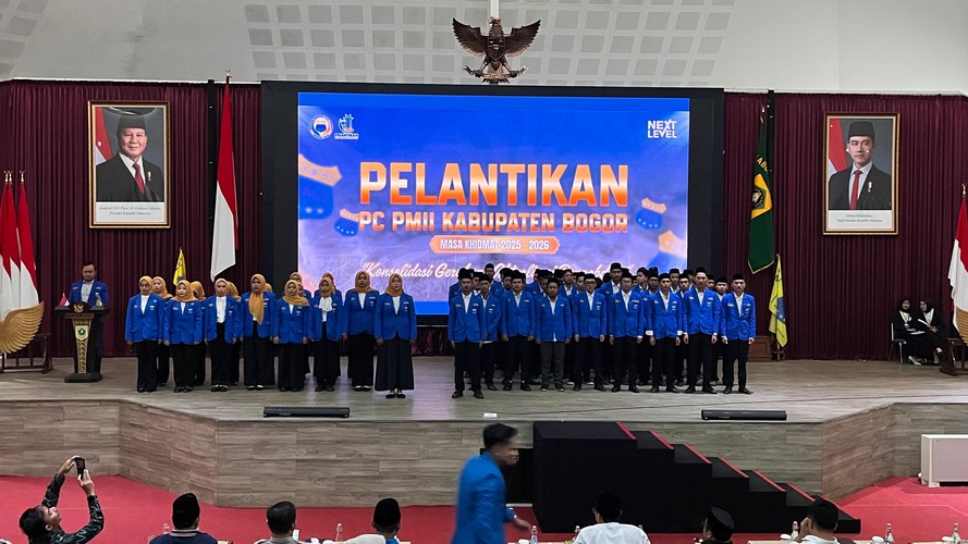 Kabarindo24jam.com | Cibinong – Sebanyak 81 Pengurus Cabang Pergerakan Mahasiswa Islam Indonesia (PMII) Kabupaten Bogor resmi dilantik dalam sebuah prosesi di Auditorium Sekretariat Daerah (Setda) Kabupaten Bogor, Sabtu (24/01/2026). Pelantikan ini menandai dimulainya kepengurusan baru yang diharapkan mampu memperkuat kontribusi mahasiswa dalam pembangunan daerah.