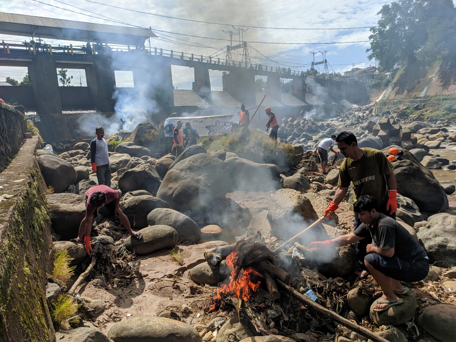 Puluhan relawan dan warga peduli lingkungan tersebut saling berjibaku membersihkan sampah-sampah buangan rumah tangga yang mengotori DAS Ciliwung, dan langsung membakarnya.