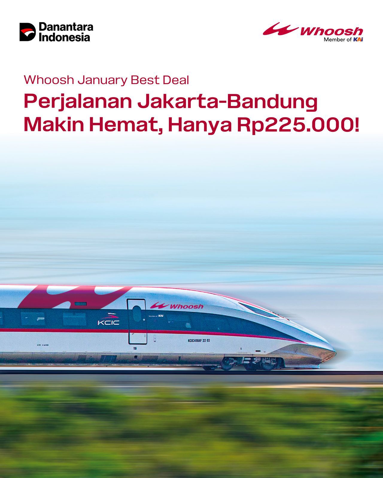 “Pada promo Whoosh January Best Deal, tiket Whoosh relasi Jakarta–Bandung maupun Bandung–Jakarta ditawarkan dengan tarif promo Rp225.000. Tarif tersebut lebih